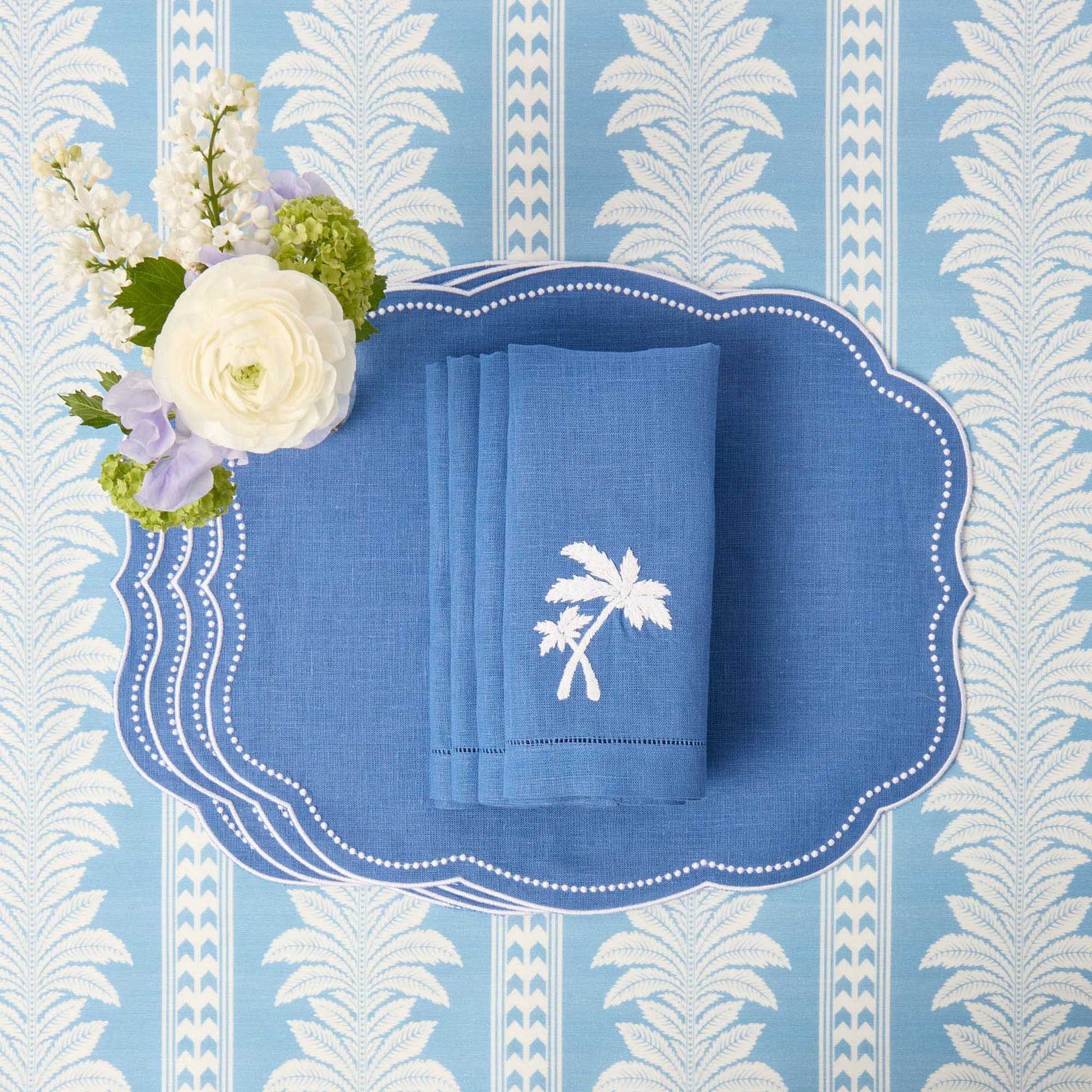 Sets de table et serviettes palmiers en lin bleu Eloise (lot de 4)