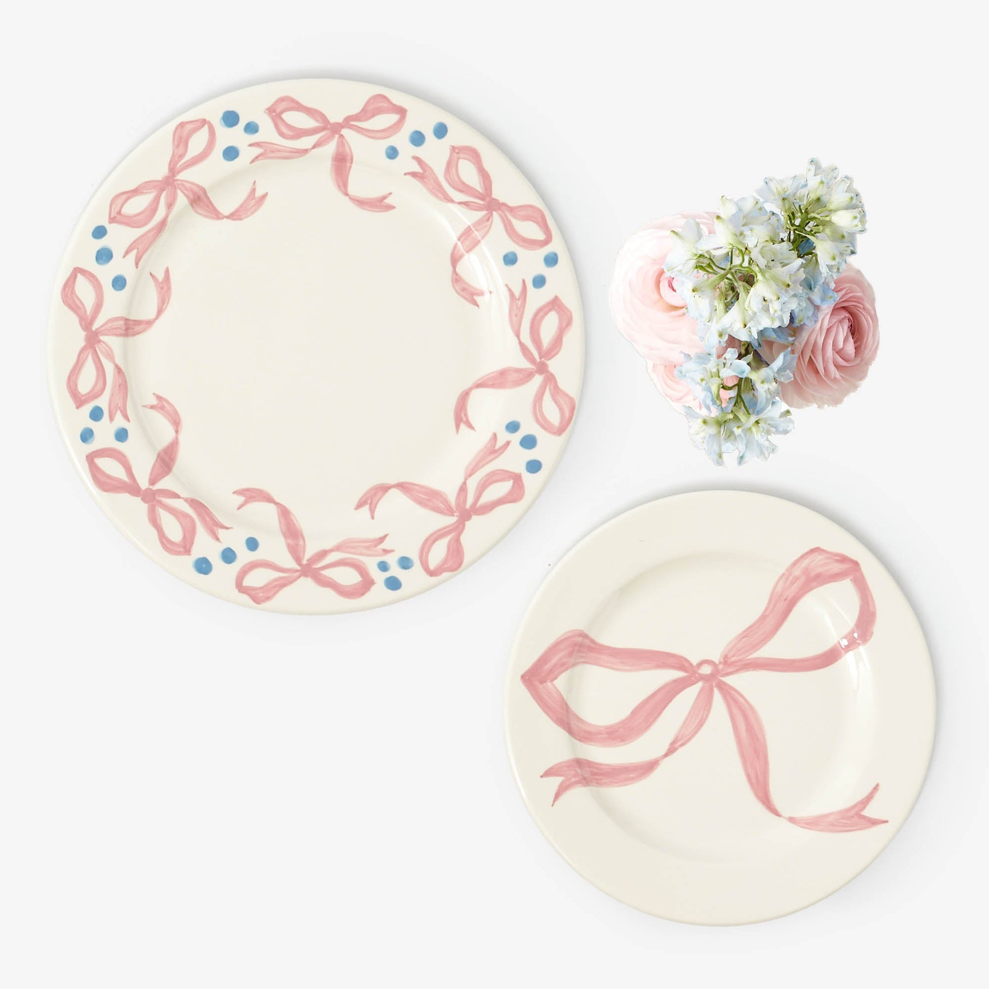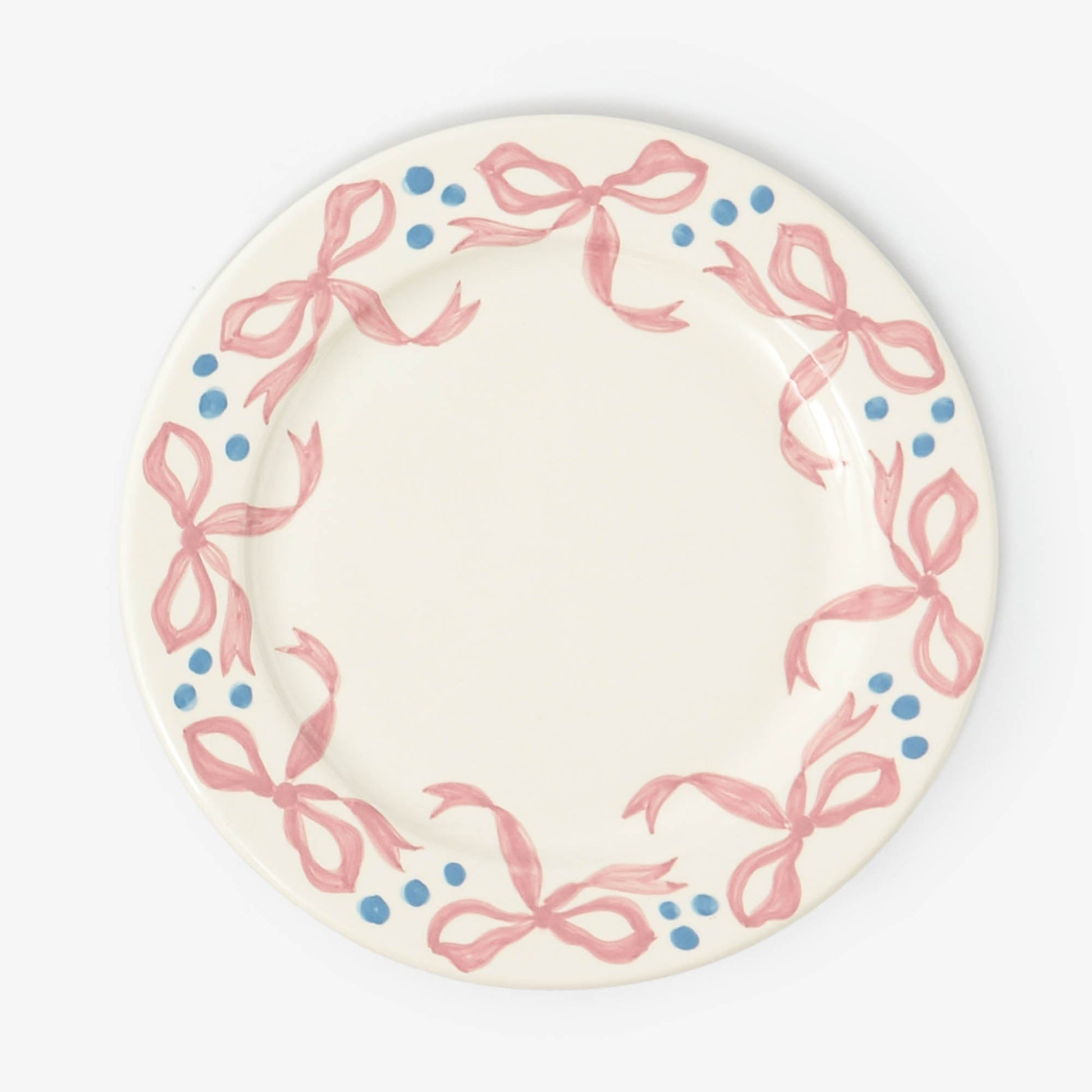 Ajoutez une touche de fantaisie à votre prochain dîner avec notre assiette plate Harley's Bow. Peinte à la main, elle est ornée du motif emblématique de Harley, le nœud, et ornée de pois bleu pastel sur le bord.