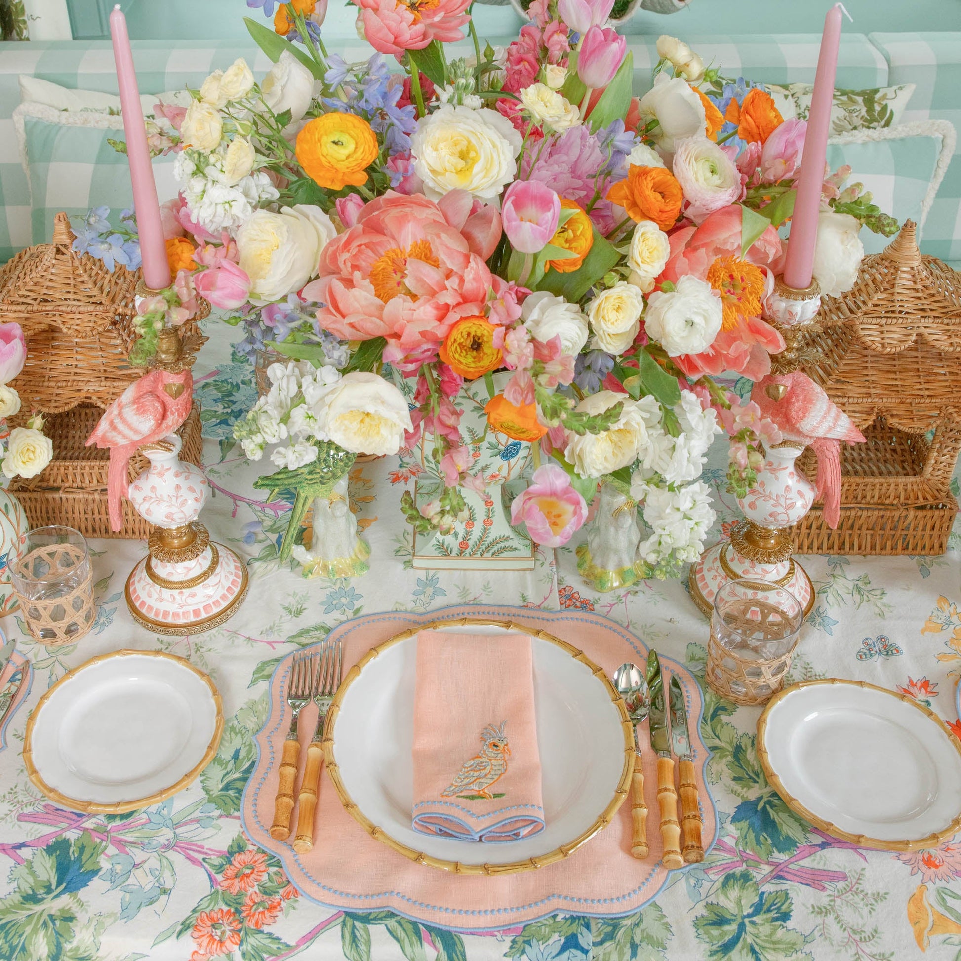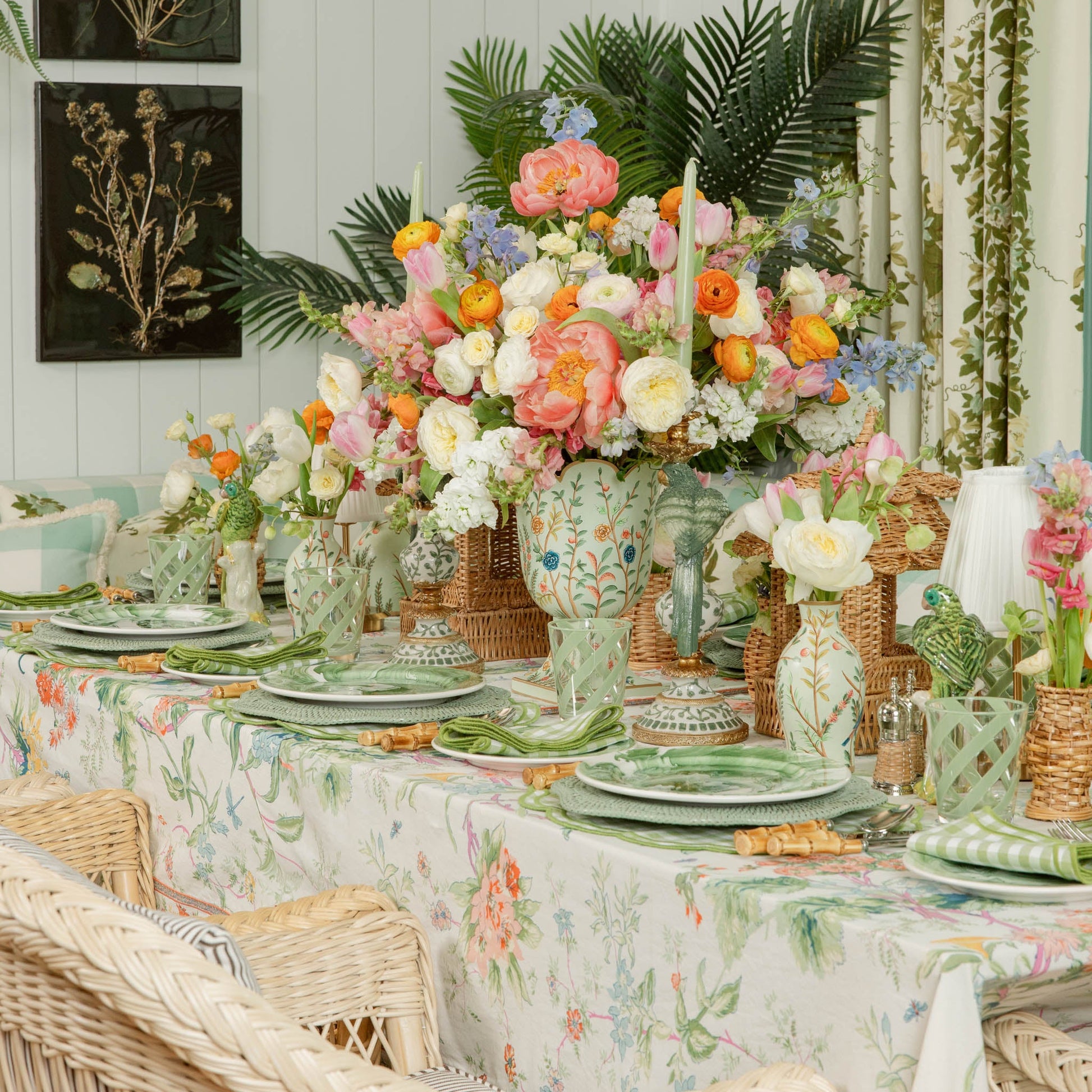 Notre nappe Jean est un lin léger et aérien au charme botanique. Son joli motif, composé de fleurs florissantes aux tons roses et bleus, en fait une option idéale pour les repas d'été. Associez-la à des tons pastel coordonnés et à des fleurs fraîches.