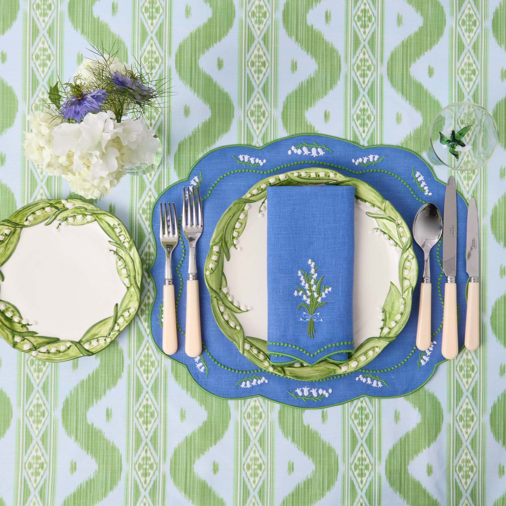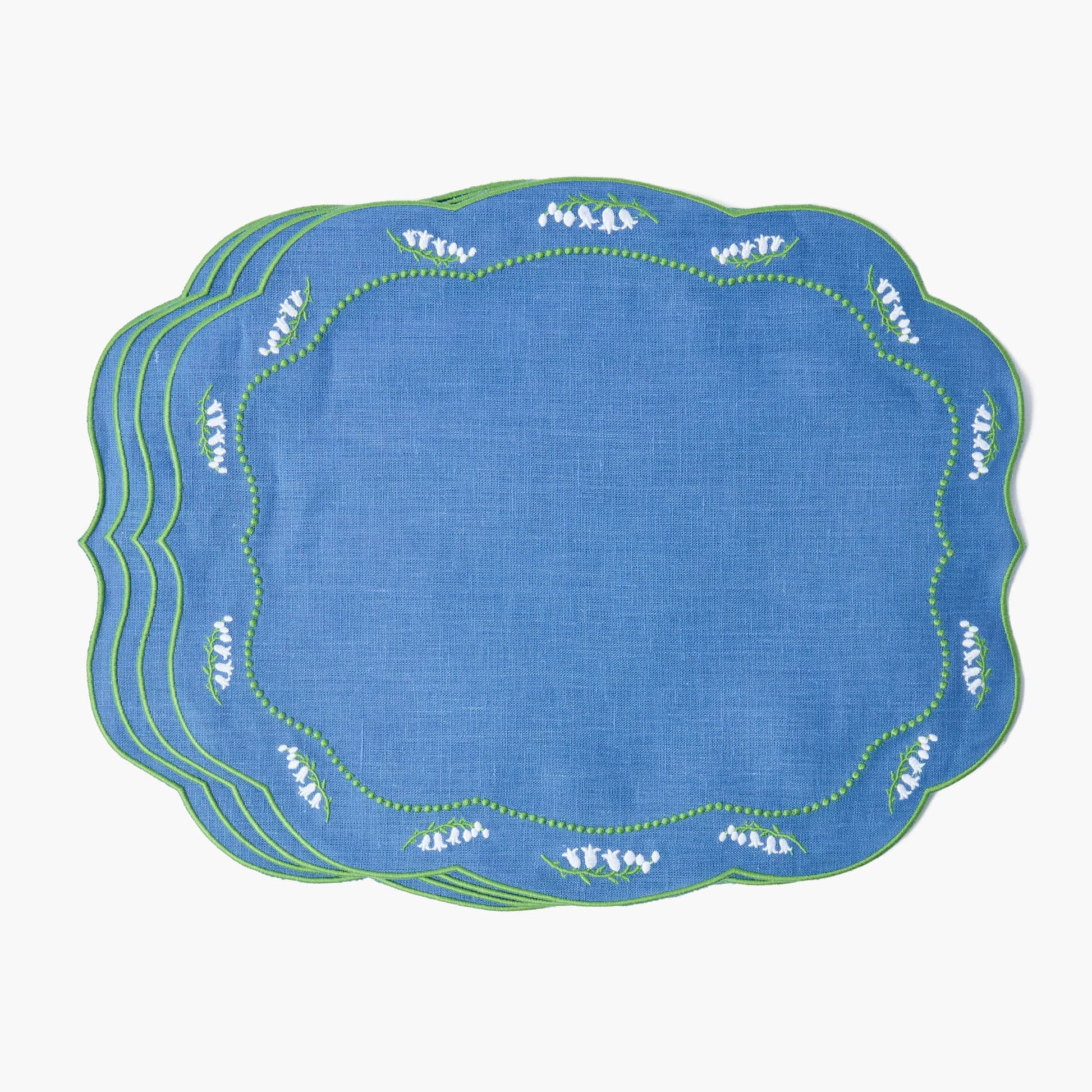 Nos sets de table en lin bleu Muguet sont une ode parfaite à la vie rurale. Ces quatre sets festonnés arborent une bordure verte raffinée et sont ornés d'un motif Muguet brodé. Associez-les à nos serviettes assorties pour un look coordonné, idéal pour les réceptions printanières et plus encore.