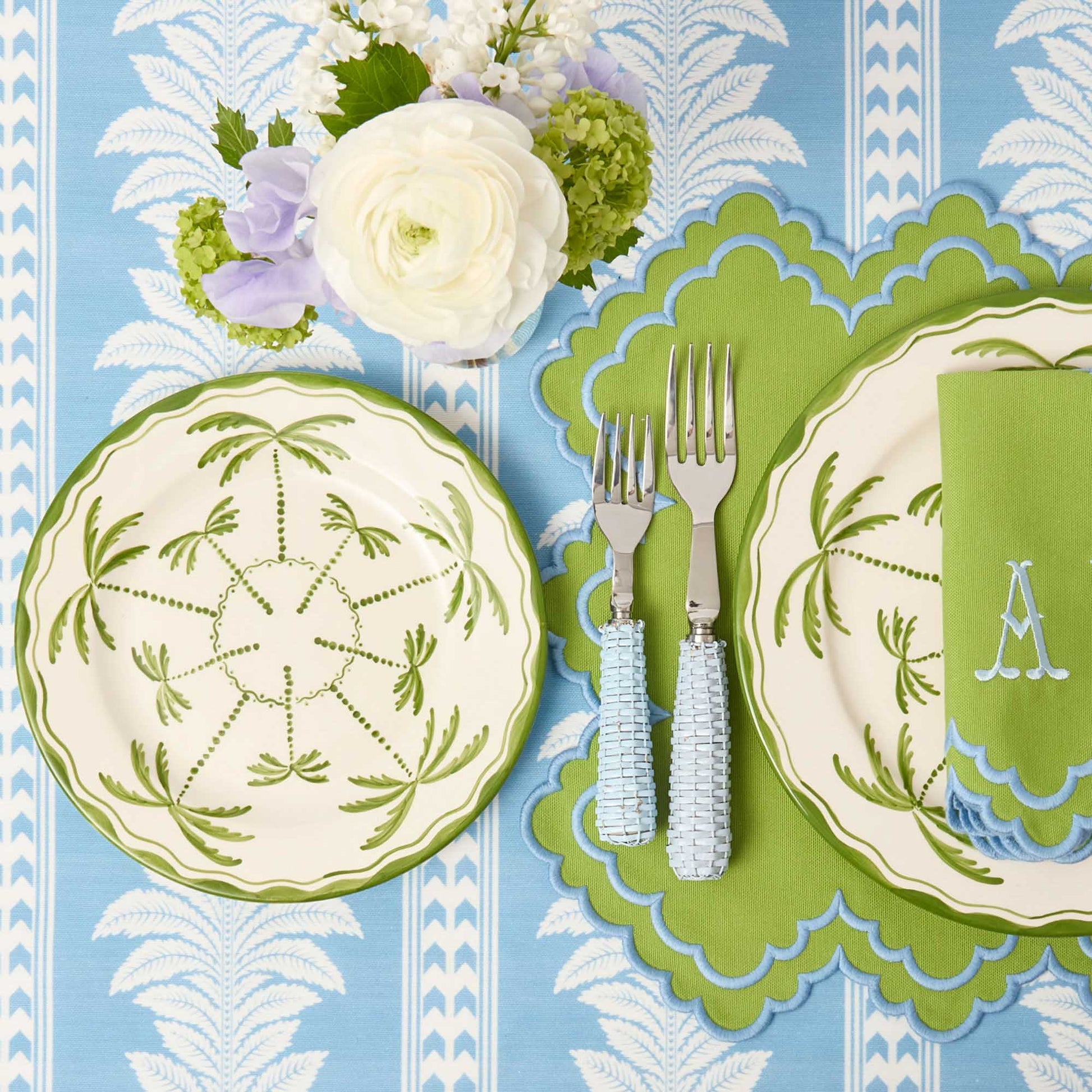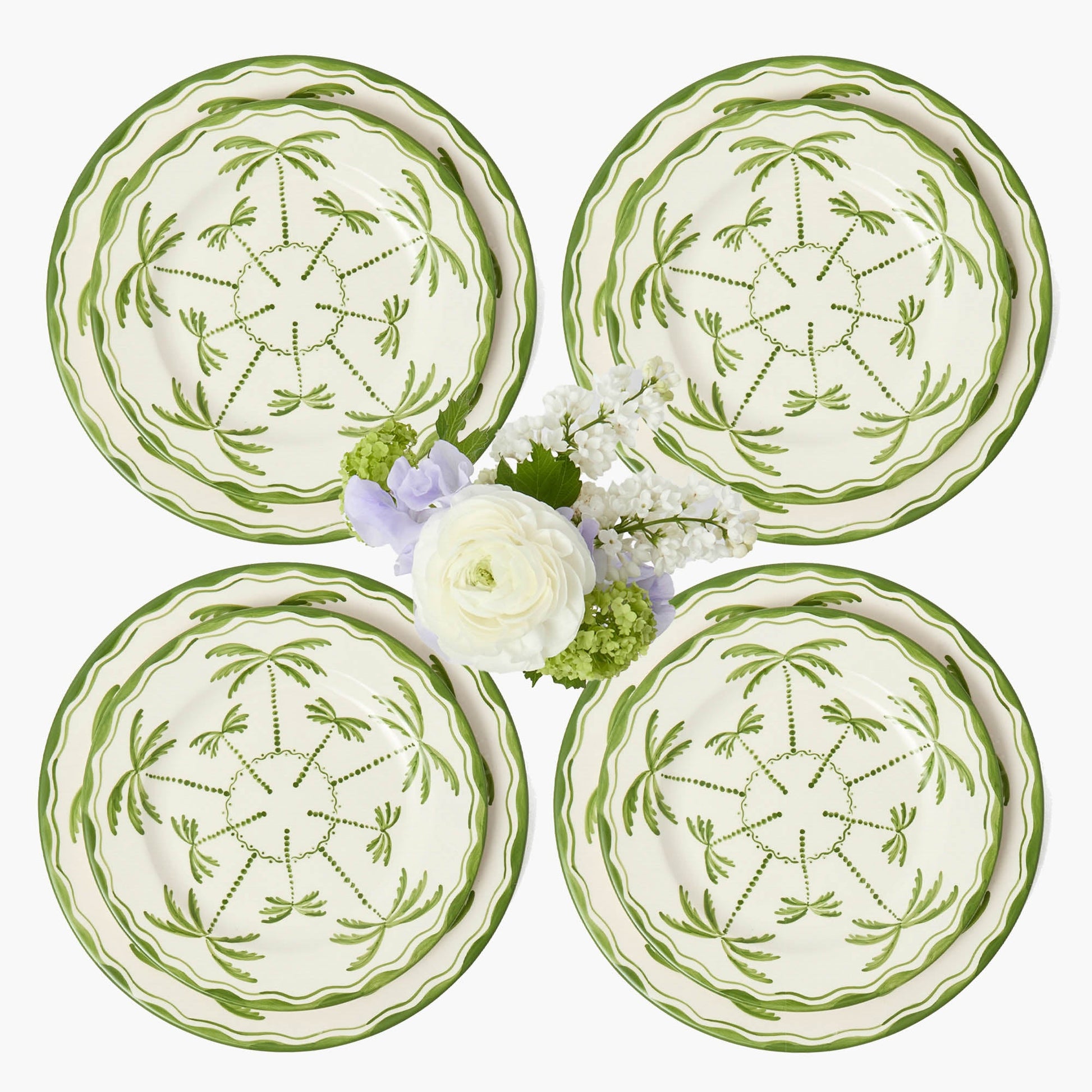 Notre service complet de vaisselle Palmera comprend huit pièces, dont quatre assiettes à dîner et quatre assiettes à dessert. Chacune de ces assiettes en céramique est ornée d'un motif de palmier coloré peint à la main au centre. Associez-la à du linge de table vert assorti pour une expérience en plein air inoubliable.