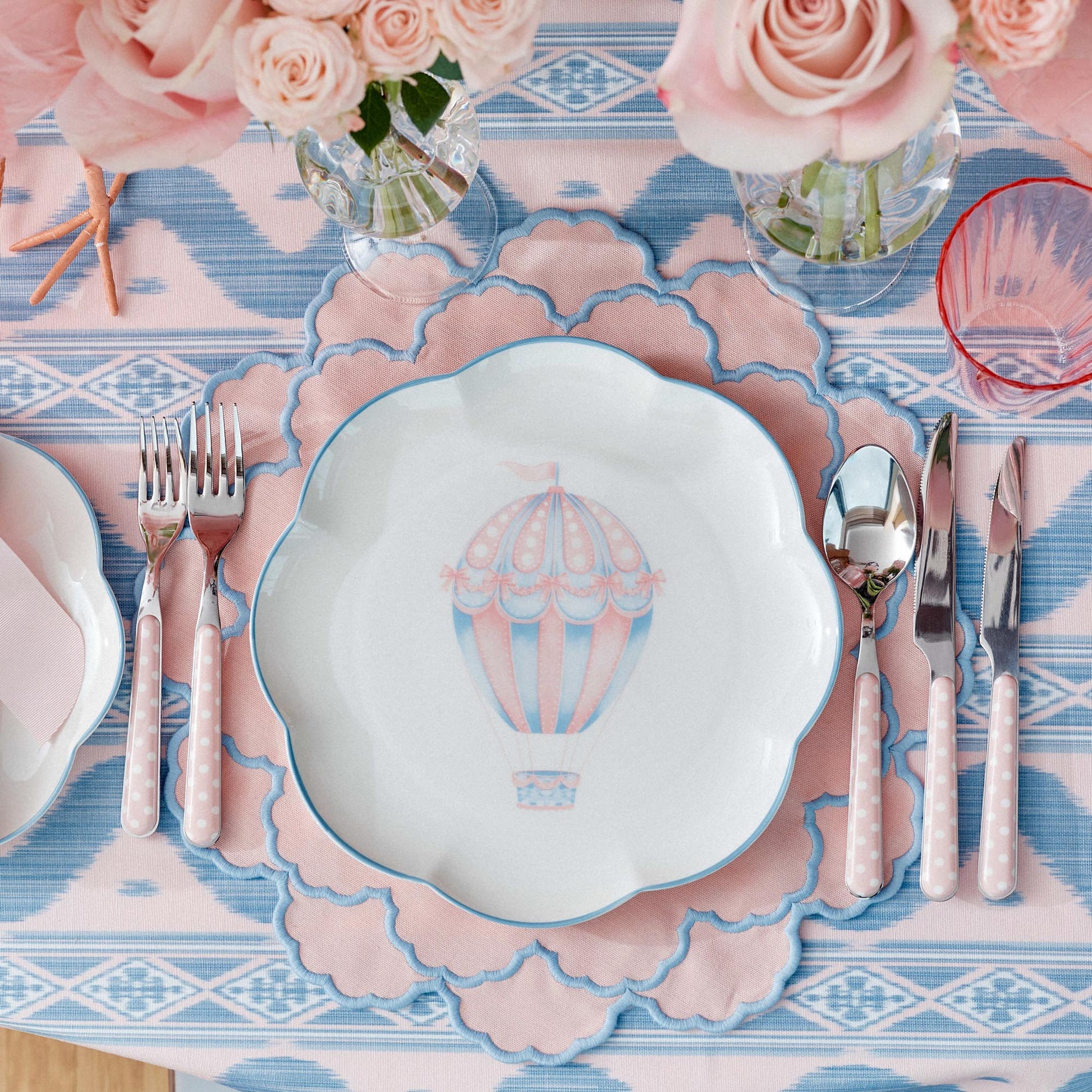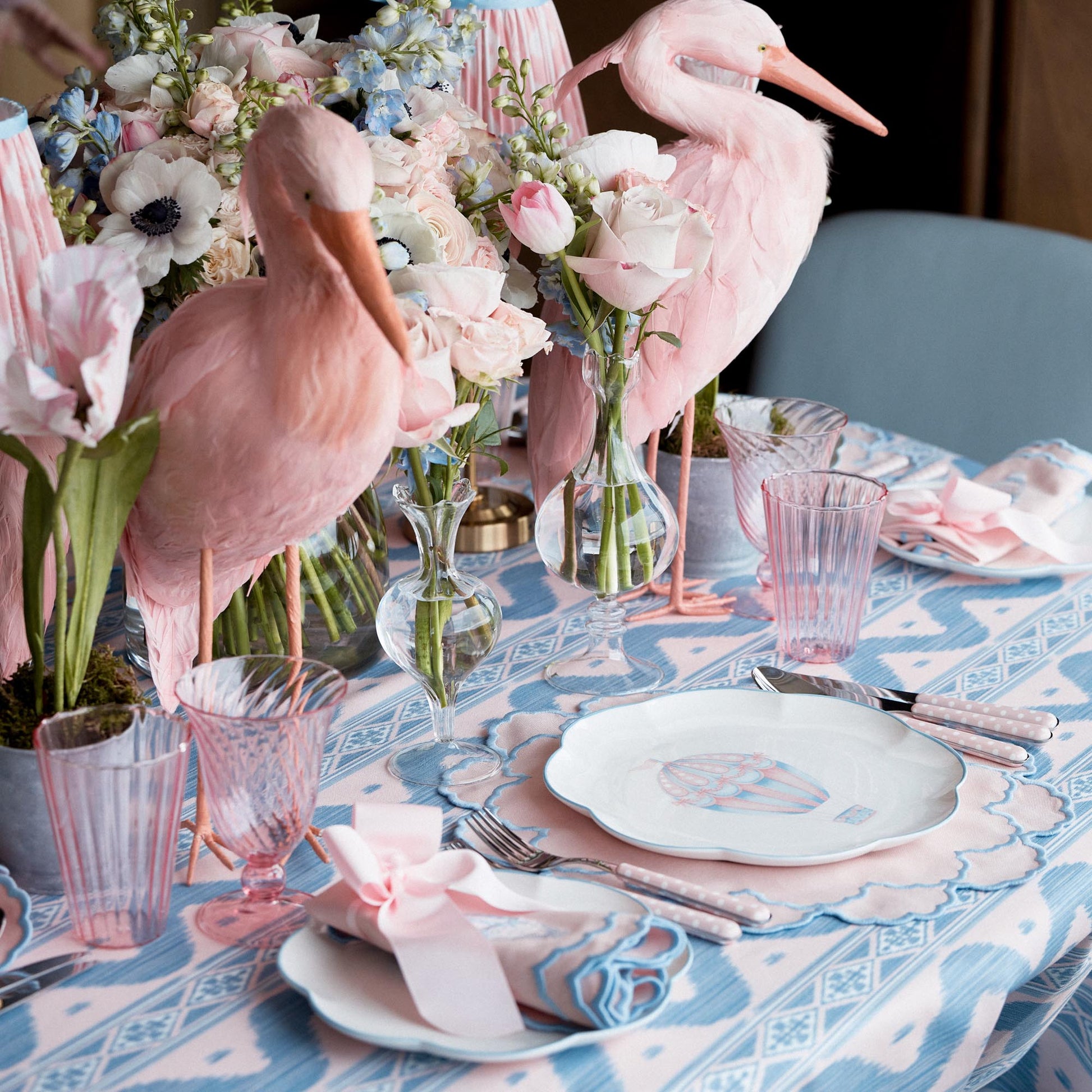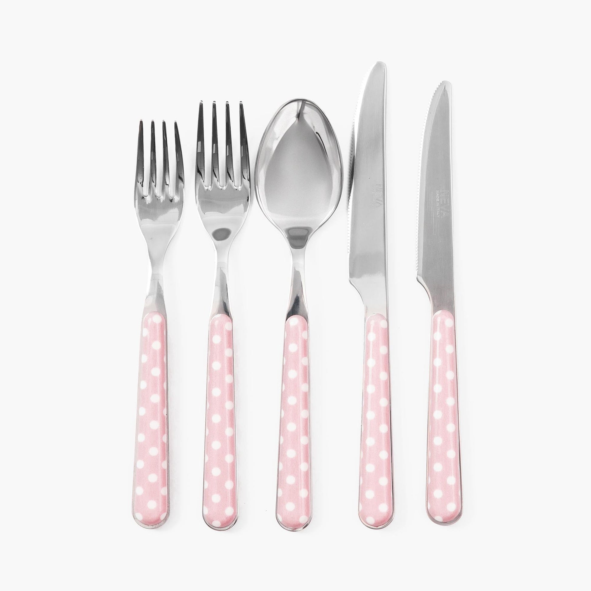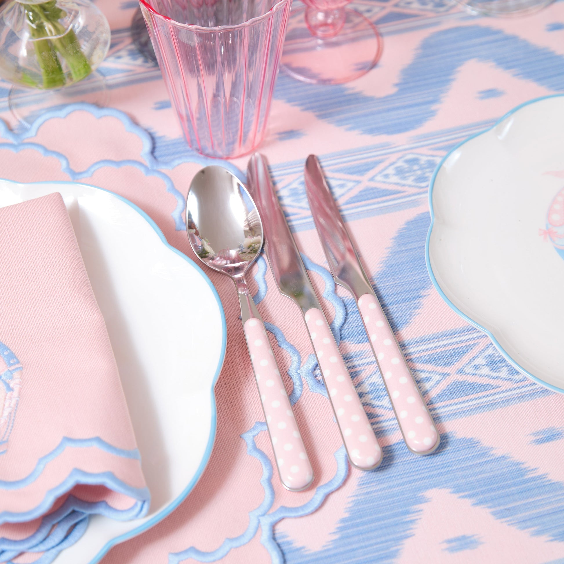 Notre ravissant ensemble de cinq couverts à pois roses sublimera n'importe quelle table. Photographié chez Alice, cet ensemble a été conçu en collaboration avec Beatrice York pour notre collection baby shower très attendue.