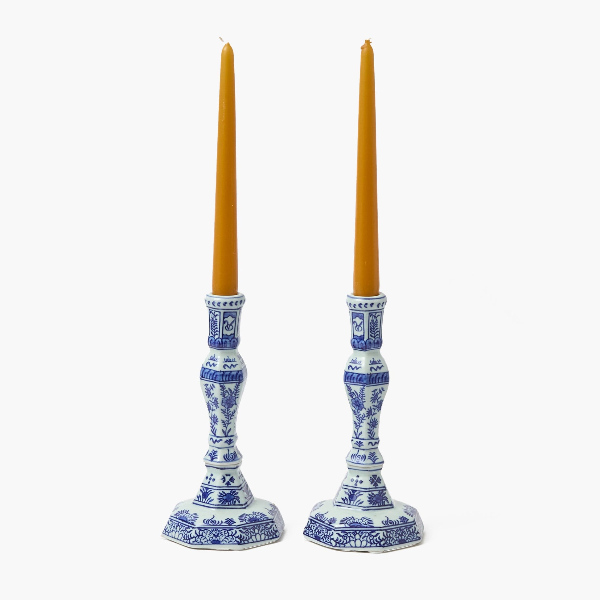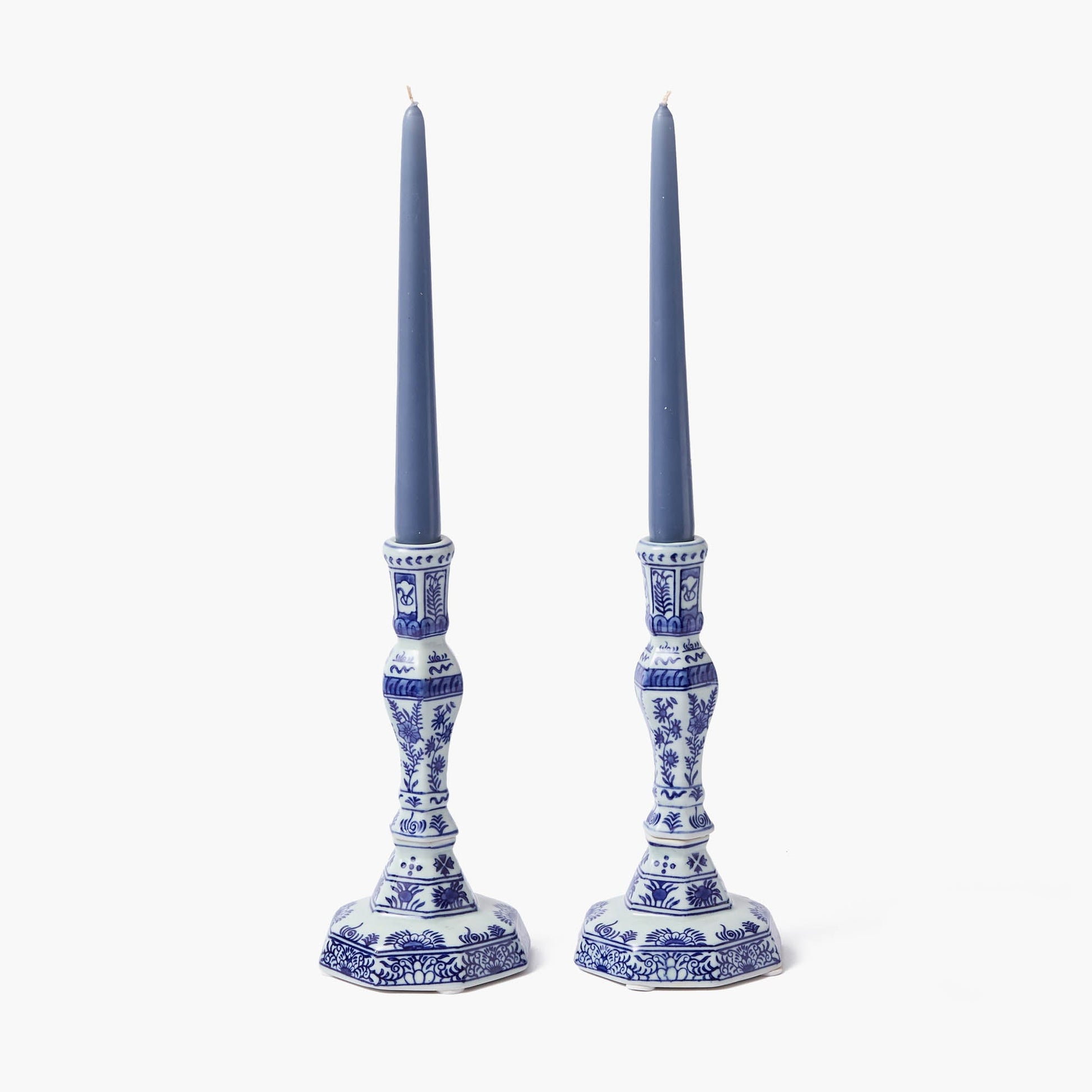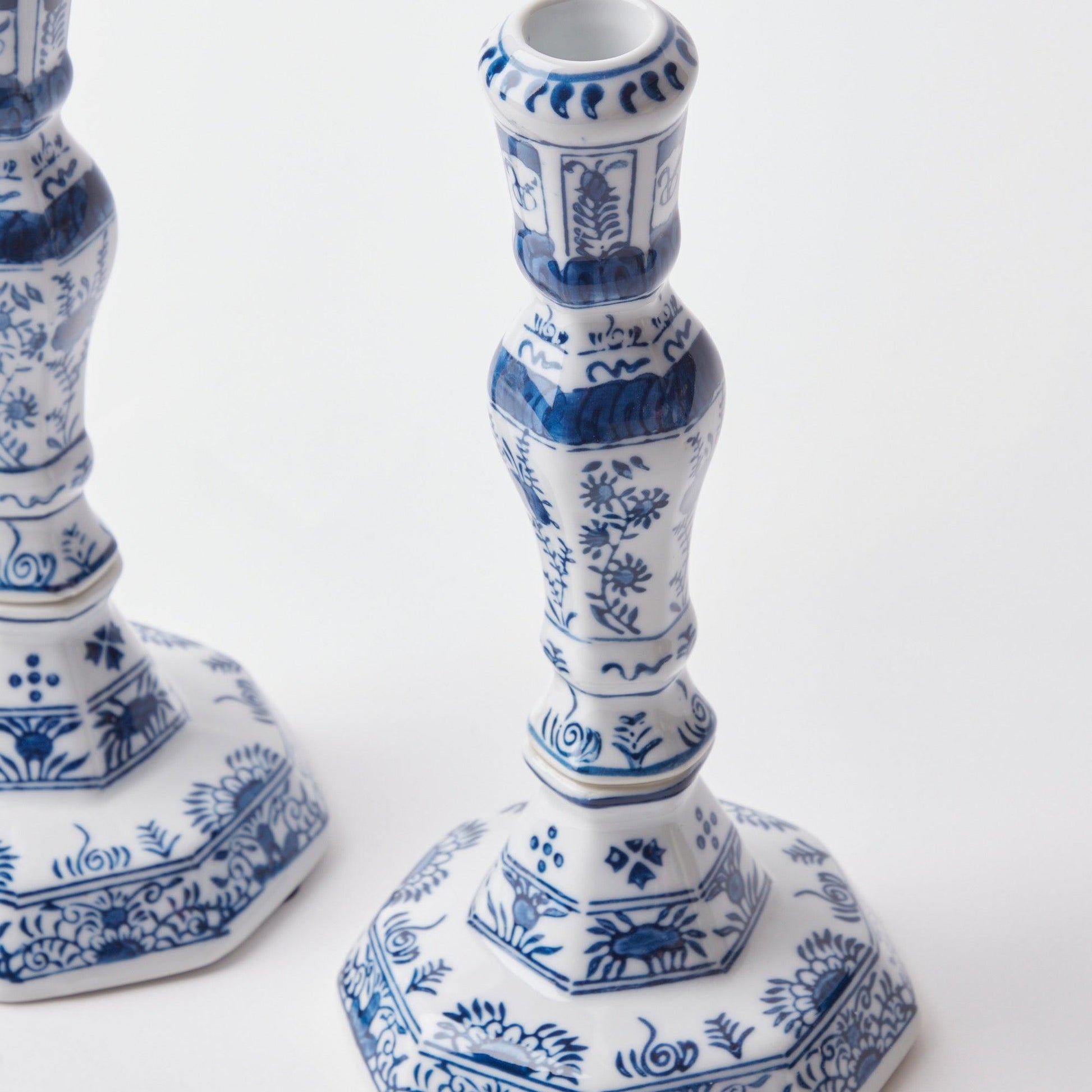 Une magnifique paire de bougeoirs bleus et blancs. Ce charmant modèle s'inspire d'un bougeoir en Delft d'Amsterdam du XVIIIe siècle. Ensemble, ils sont parfaits pour les repas en intérieur comme en extérieur.