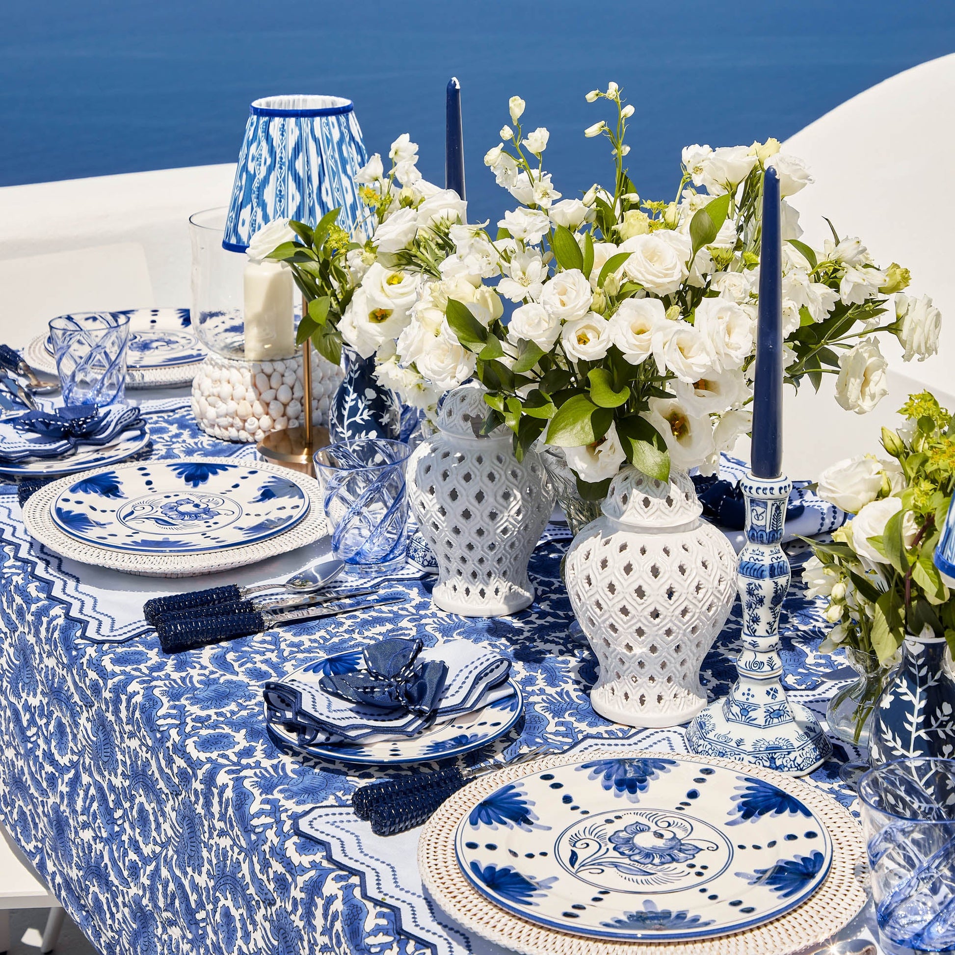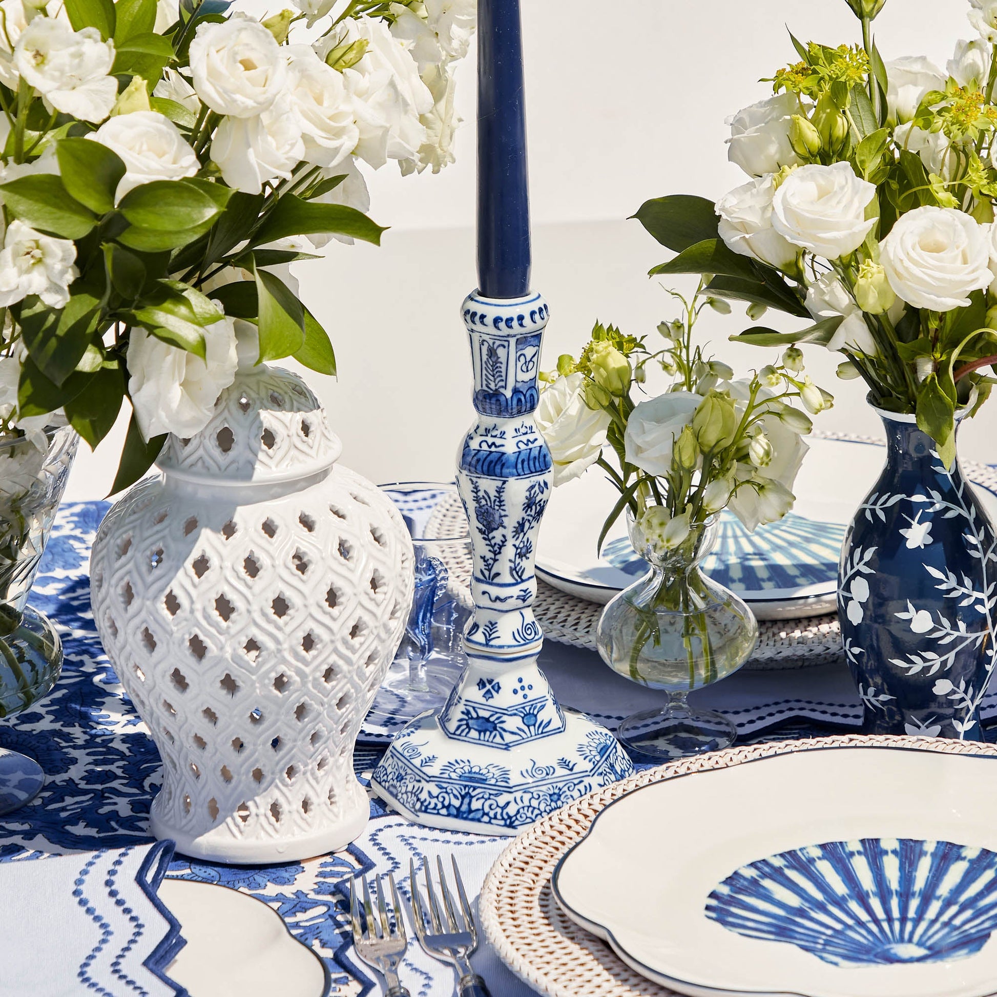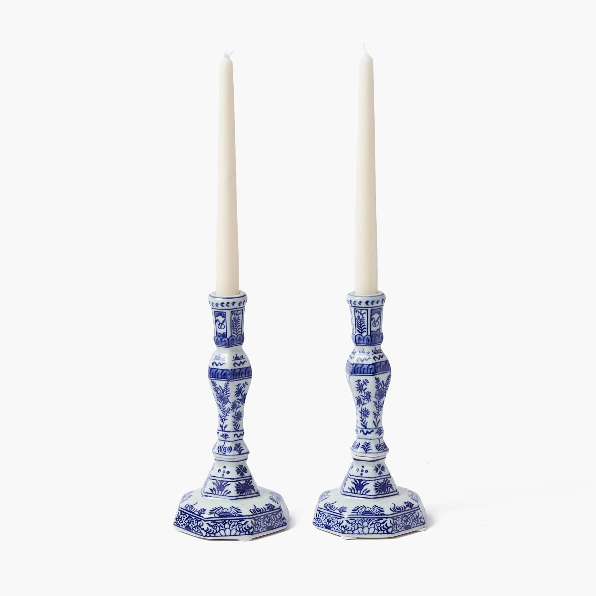 Une magnifique paire de bougeoirs bleus et blancs. Ce charmant modèle s'inspire d'un bougeoir en Delft d'Amsterdam du XVIIIe siècle. Ensemble, ils sont parfaits pour les repas en intérieur comme en extérieur.